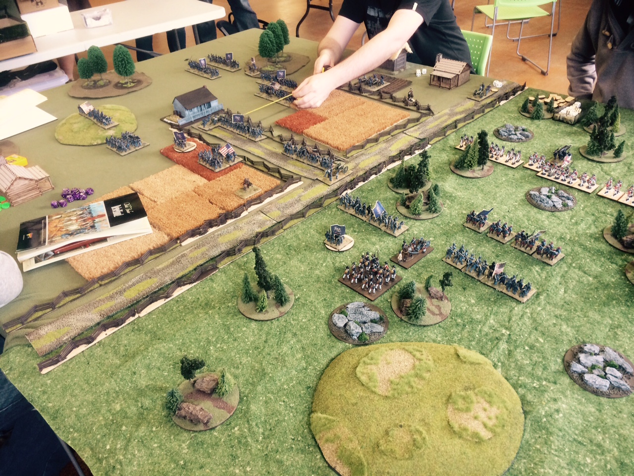 A view of the table and some of the terrain we have been working on. My arms are in shot at the top as I manoeuvre the second British Brigade into position. Photo: Richard Steer. |